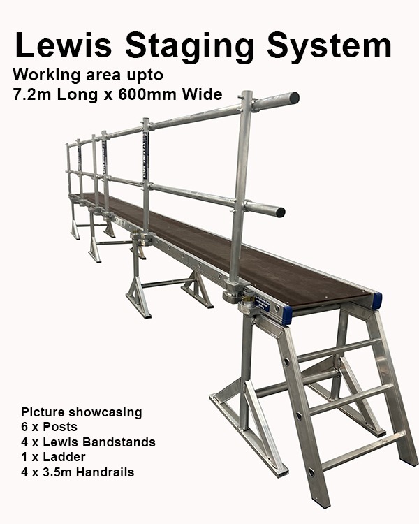 The NEW Lewis Staging and Bandstand system extends up-to 7.2m long x 600mm Wide, The Handrails and Ladder are all supplied as part of the package. Weight loads up-to 300kg with working heights up to 3m. Bandstands are designed for the Lewis Staging Boards only.